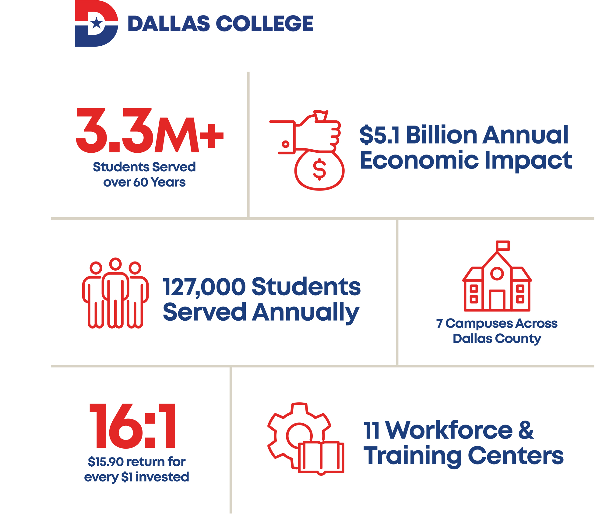 With a $5.1 billion annual economic impact and over 3 million students educated in our 60 year history, Dallas College is woven into the region’s growth story. One in five jobs across North Texas carries a connection to the institution’s classrooms, labs or workforce partnerships.